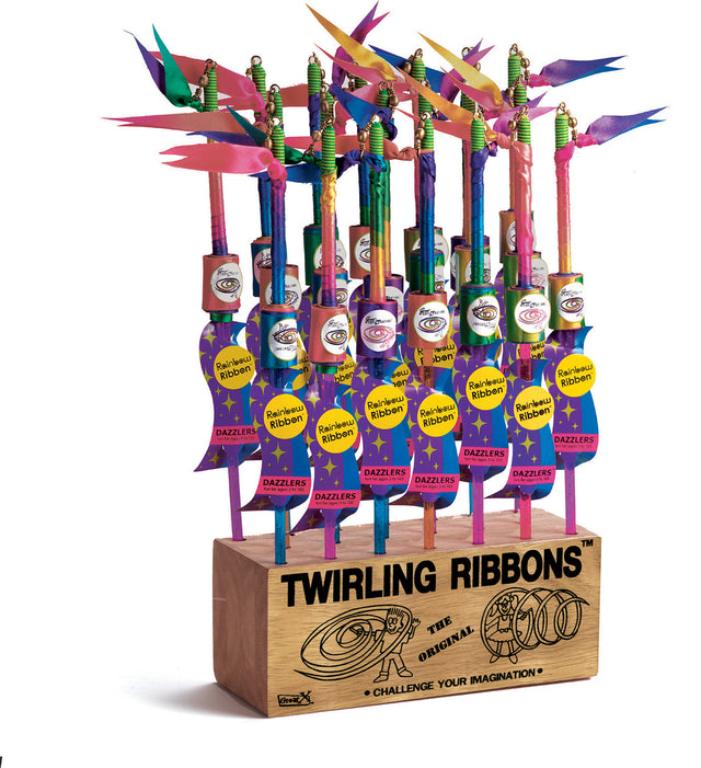 A beautiful rainbow ribbon on a colorful glittering wand. Dazzlers are a hit with kids who like to twirl, dance and do rhythmic gymnastics. Display comes with 36 units.