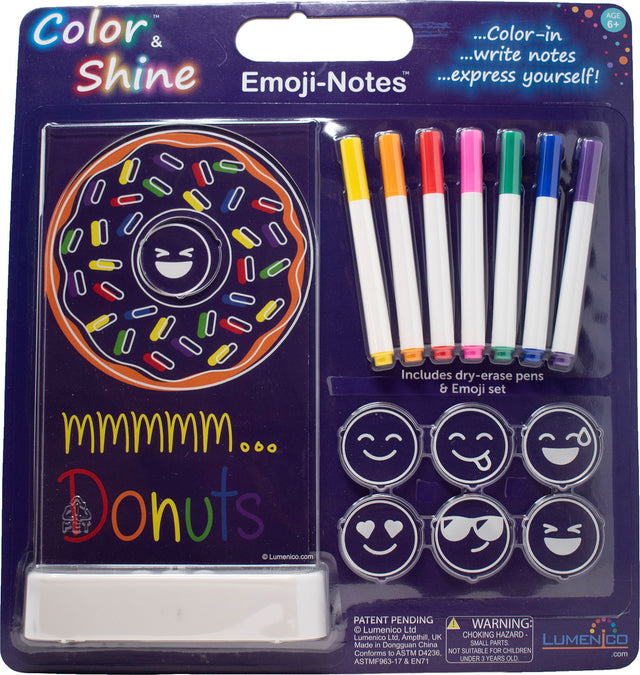 Light up craft kit for young artists. Donut Emoji-Notes design with 7 Emoji disks, 7 pens & white LED dimmable base. Color on the screen and turn on the light to see it shine. This is a product to light up your child's artwork shine.