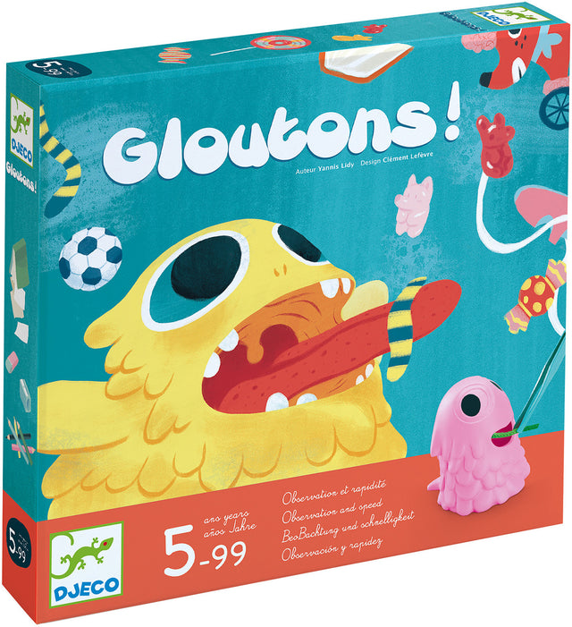 In Gloutons, each player has a hungry monster and tweezers to retrieve food. Strings are placed in the middle of the table and a player turns over a card. Players must simultaneously pick up the objects indicated on the card with their tweezers and maneuverer them into their monster?s mouth. As soon as a player thinks they are finished, they yell out ?Glutton? and the game stops.